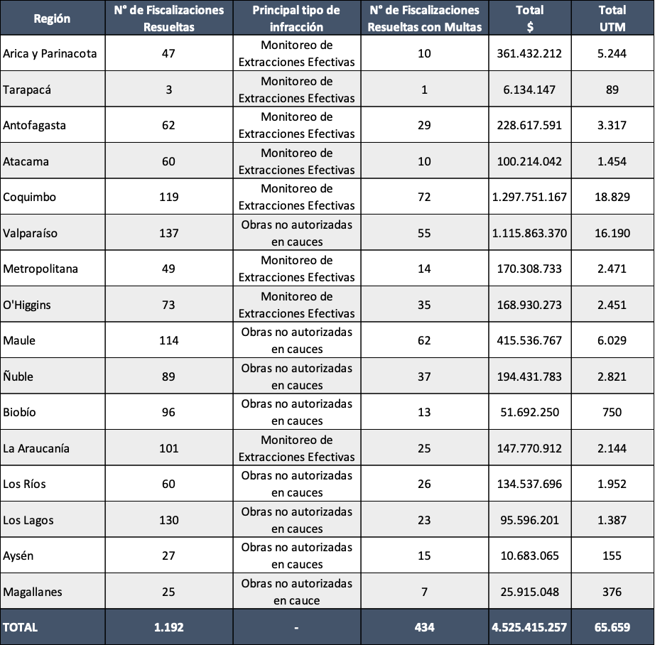 Los cuatro tipos de infracciones al Código de Aguas más multadas a nivel nacional fueron el incumplimiento al Sistema de Monitoreo de Extracciones Efectivas (38%), mediante el cual el titular de un derecho de aprovechamiento de aguas tiene el deber de registrar la obra de captación de agua, instalar un sistema de medición y transmisión e informar la extracción de caudales a la DGA; ejecución de obras no autorizadas en cauces (37%); extracción no autorizada de aguas (15%) y extracción de áridos no autorizadas en cauces (4%).