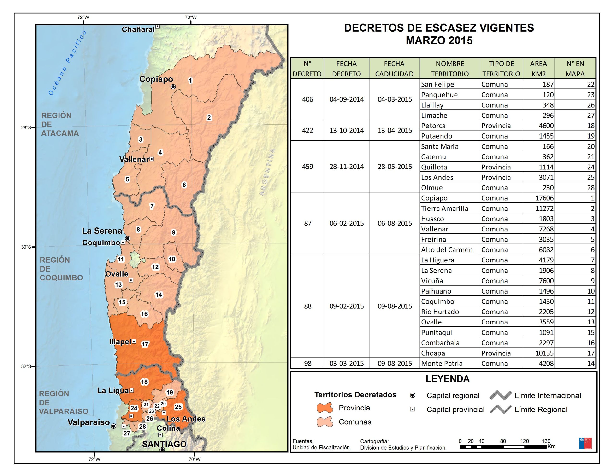 Tambiénen la IV región están declaradas como zona de escasez las comunas de LaHiguera, La Serena, Coquimbo, Paihuano, Vicuña, Río Hurtado, Ovalle, Punitaqui,Combarbalá, Illapel Salamanca, Los Vilos y Canela,además de 6 comunas en Atacama y 18 municipios de Valparaíso
