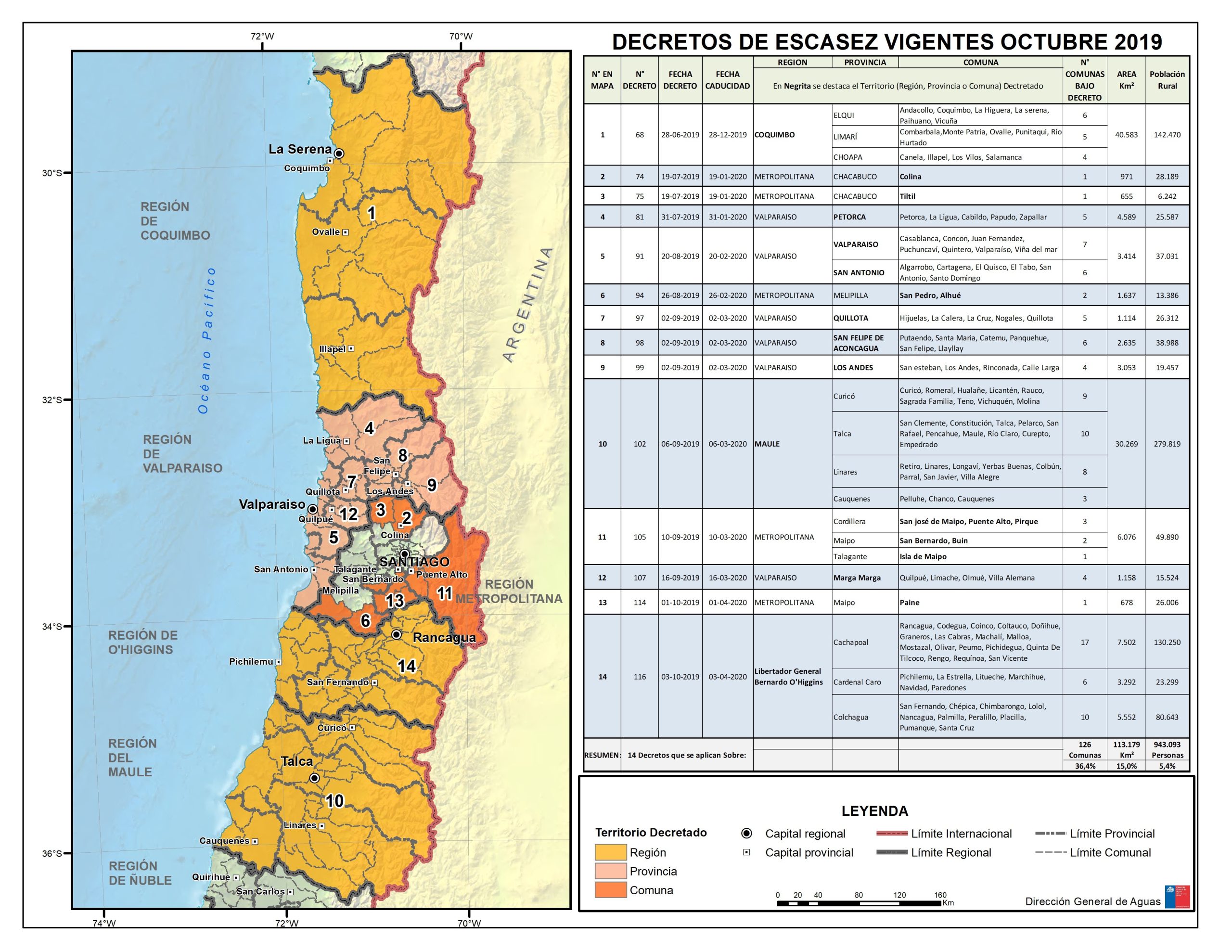 A la fecha hay 14 decretos de escasez hídrica que se aplican en 126 comunas de las regiones de Coquimbo, Valparaíso, Metropolitana, O´Higgins y del Maule, en las cuales la población rural llega a 940.000 personas.